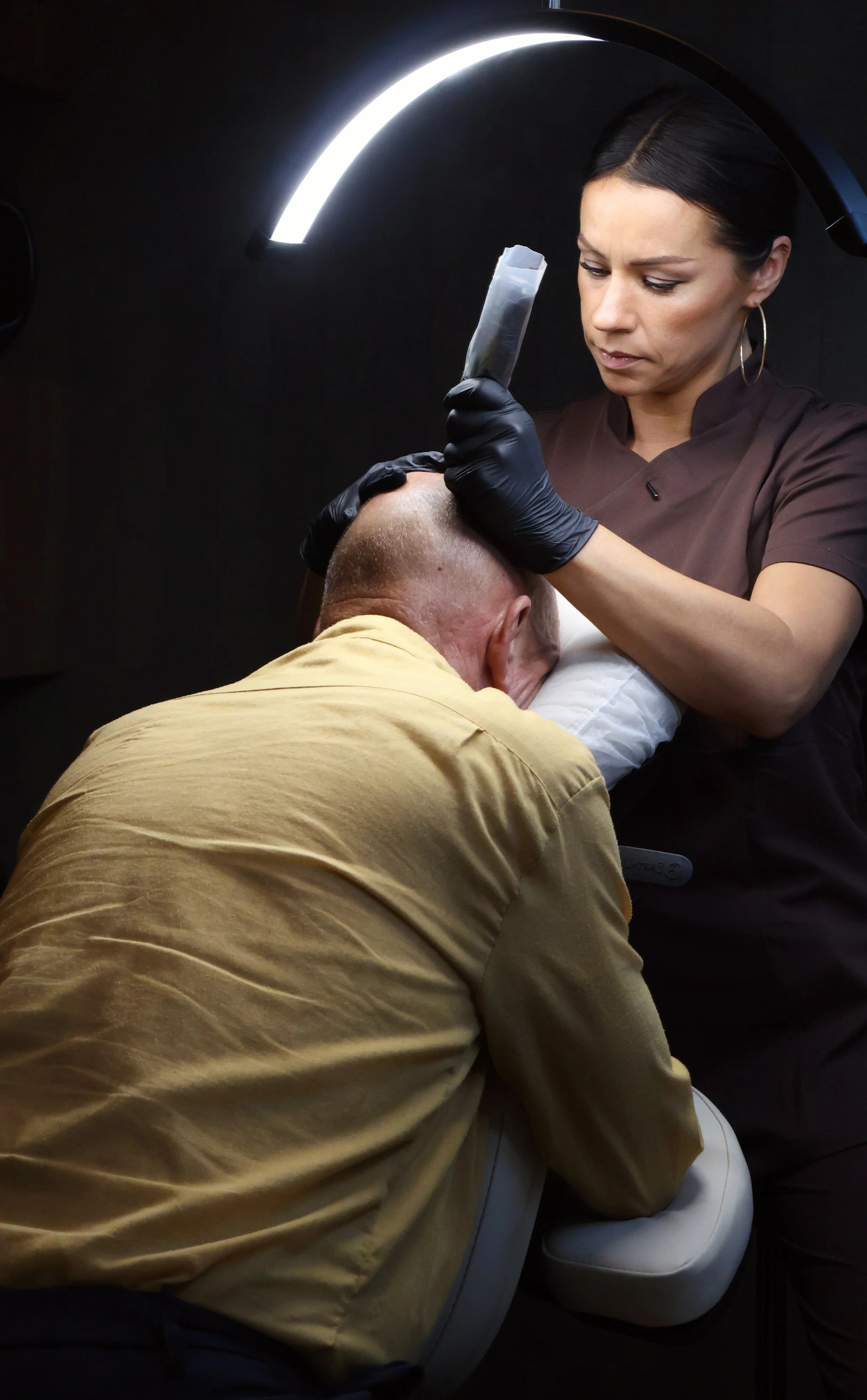 Microhaarpigmentatie is niet te vergelijken met een traditionele tatoeage. Er wordt gewerkt met een volledig andere techniek, speciale naalden en hoogwaardige pigmenten die specifiek zijn ontwikkeld voor de hoofdhuid. Deze pigmenten zijn biologisch en veel subtieler dan conventionele tatoeage-inkten. Bij MHP brengen we met uiterste precisie microscopisch kleine puntjes aan, die de illusie van natuurlijke haarstoppels creëren. Het resultaat is fijner en realistischer dan wat met een klassieke tatoeage mogelijk is. De behandeling is bovendien aanzienlijk minder pijnlijk dan een gewone tatoeage. Na de sessie kan de hoofdhuid licht gevoelig zijn of wat roodheid tonen, maar dit verdwijnt meestal binnen korte tijd. Wat overblijft, is een natuurlijk, strak resultaat dat jarenlang meegaat.
